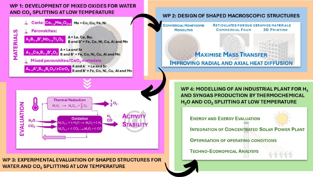 Development of mixed cerium oxides, perovskite system and mixed perovskites/CeO2 materials with exceptional performance for the production of hydrogen and syngas by means of thermochemical cycles at 700-1000 °C.